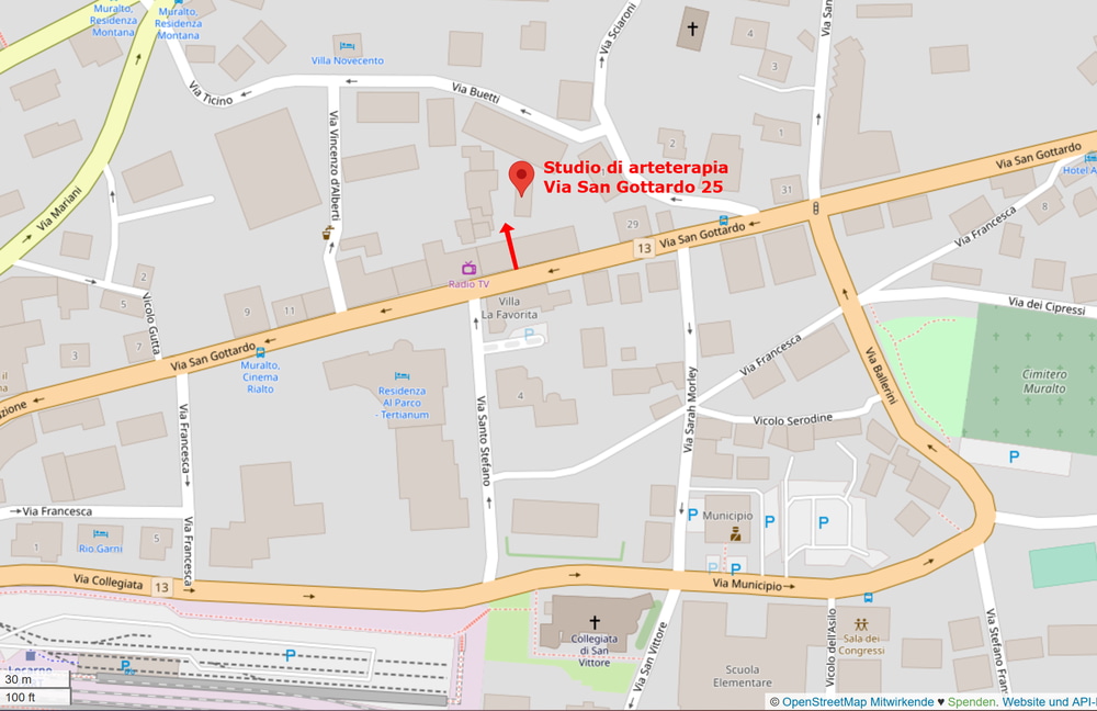 Lo studio si trova a Muralto in Via San Gottardo 25, di fronte alla Casa Anziani Tertianum Residenza Al Parco, all’interno di un cortile con vari professionisti della sanità. L’atelier è al 1° piano sopra allo studio di Ergoterapia situato sulla destra nel cortile. Appena entrati prendete la porta sulla destra. Ci sono delle scale, in caso di mobilità ridotta contattatemi prima.
